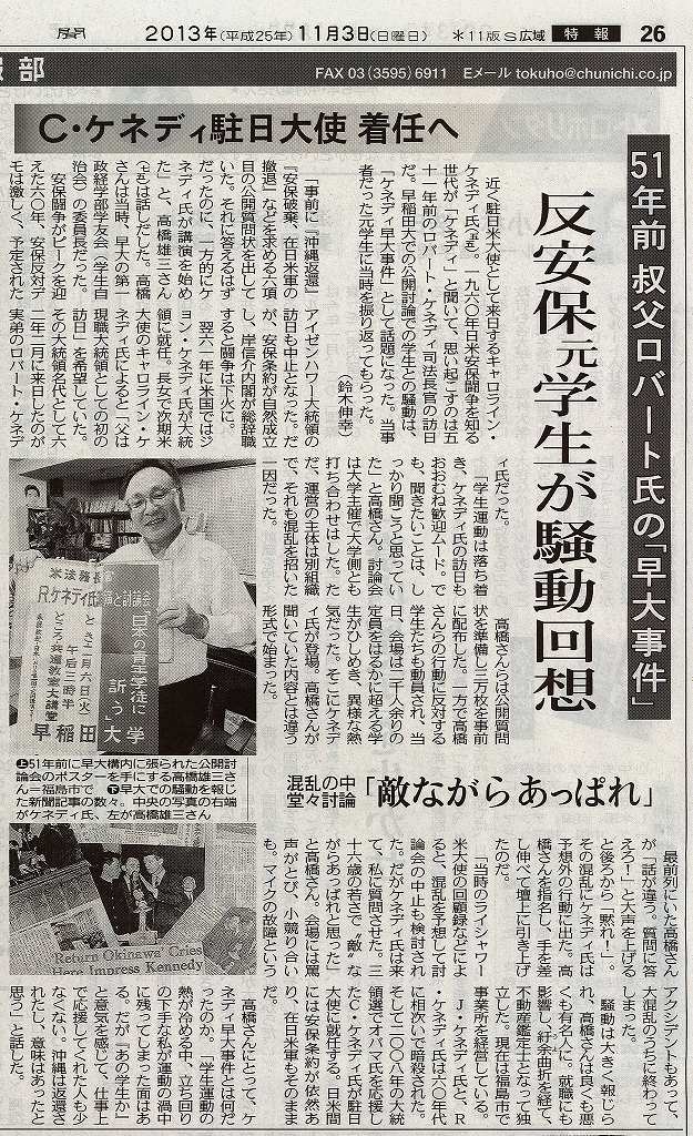 51年前の2月に、米司法長官だったR・ケネディ氏が来日し、早稲田大学の大隈講堂で講演と公開討論会を行った時のことで、3時間余りの取材でした。